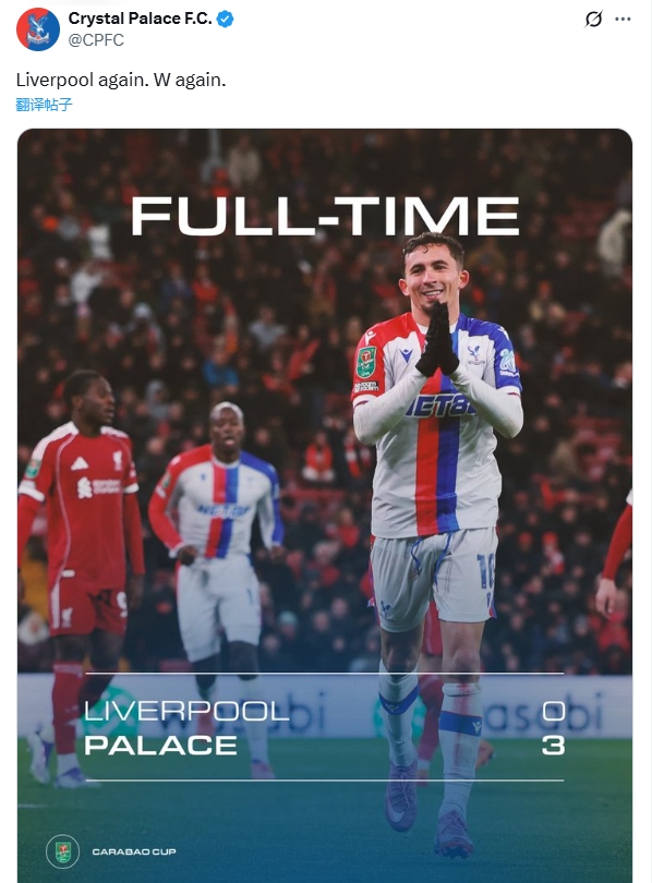 > 扎心了!水晶宫社媒:又是利物浦,又是一场到手