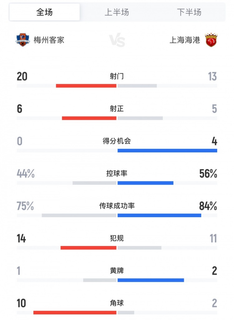 梅州vs海港全场数据:射门20-13,控球率44%-56%,角球10-2