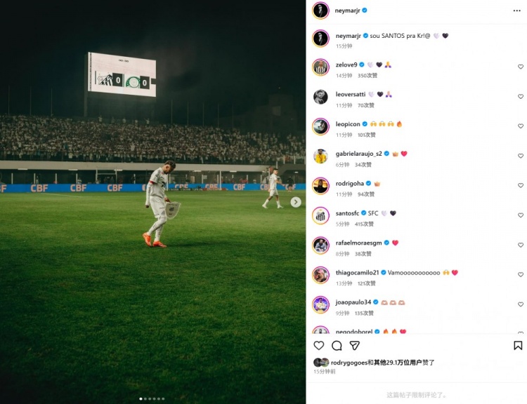 赛后内马尔也在社媒晒出本场个东谈主像片,配文写谈:“我是长期的桑托斯球迷!”