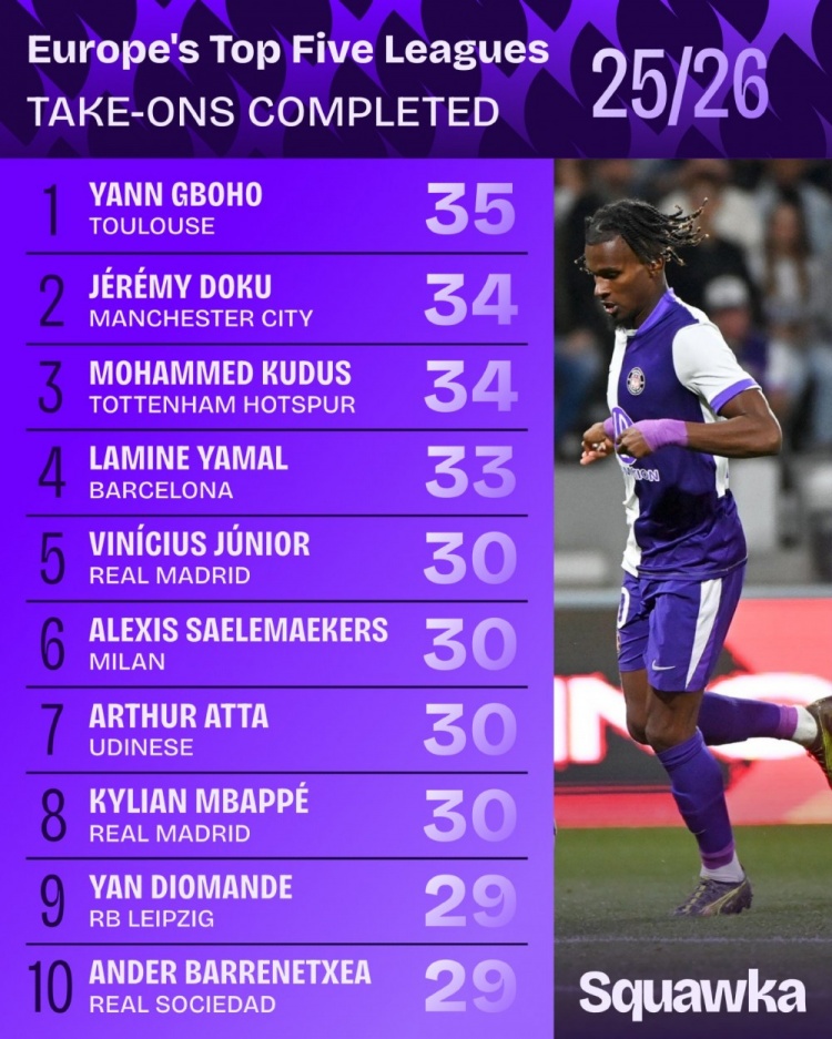 五大联赛告捷过东说念主榜:多库、库杜斯均第二 亚马尔、维尼修斯在列
