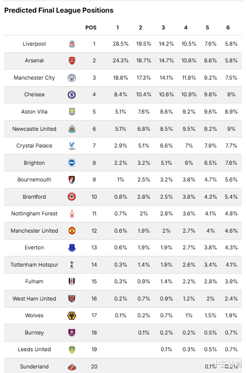 而排行第五的热点是阿斯顿维拉(入围前五概率为38.1%),接下来按序是纽卡斯尔第六、水晶宫第七,起原传统强队布莱顿。