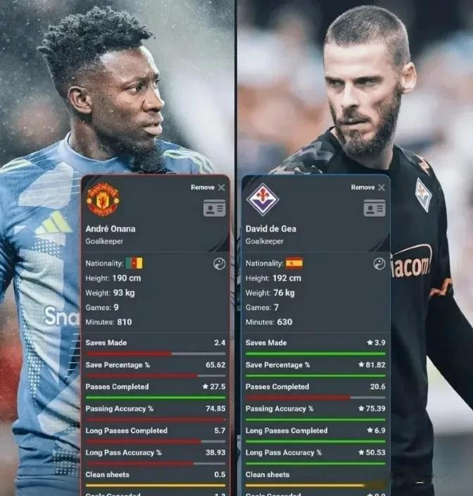 德赫亚场均长传6.9次,得胜率50.53%;奥纳纳场均长传5.7次,得胜率独一哀怜的38.93%