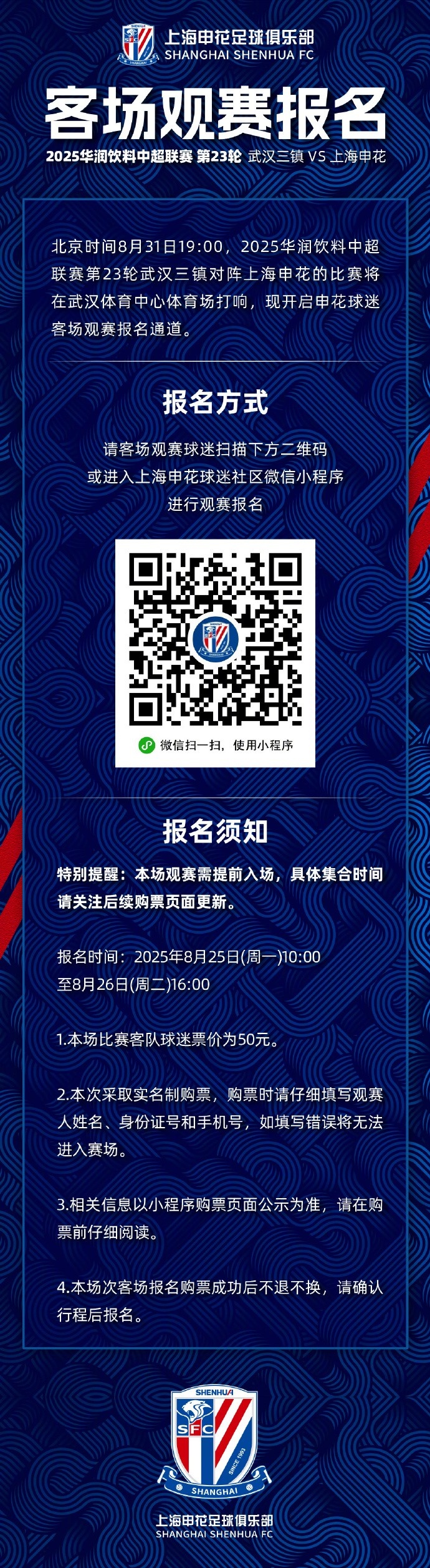 2025华润饮料中超联赛第23轮 武汉三镇 VS 上海申花 客场不雅赛报名