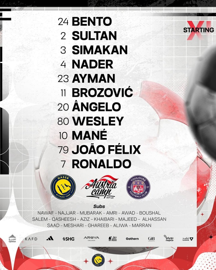 利雅得奏效vs图卢兹首发:菲利克斯首秀联手C罗!马内 西马坎先发
