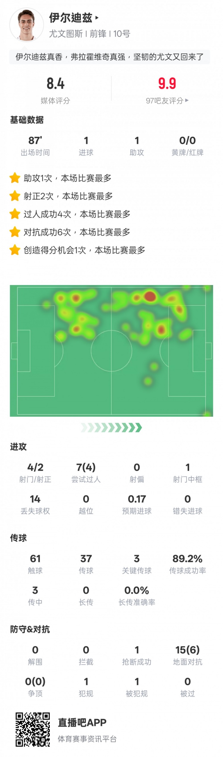 伊尔迪兹本场比赛数据:传射立功+4过东谈主胜利3关键传球,评分8.4