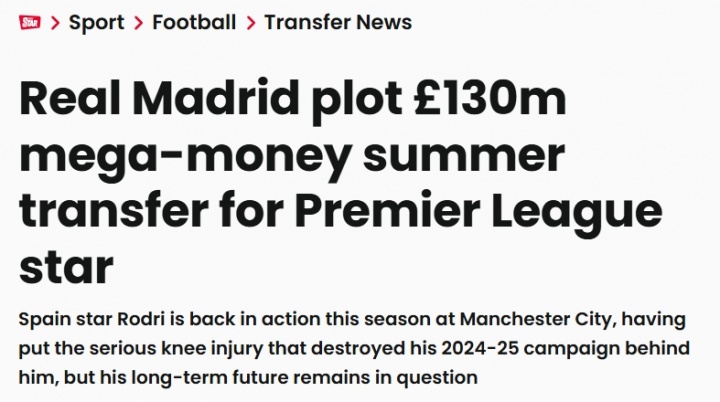 据英媒小报《逐日星报》报说念,皇马正计算对曼城发动转会“突袭”,可能以1.3亿镑的价钱收购罗德里。