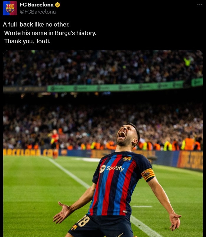 巴萨官方写说念:“一位情投意合的边后卫。在巴萨历史上留住了我方的名字。谢谢你,乔迪。”