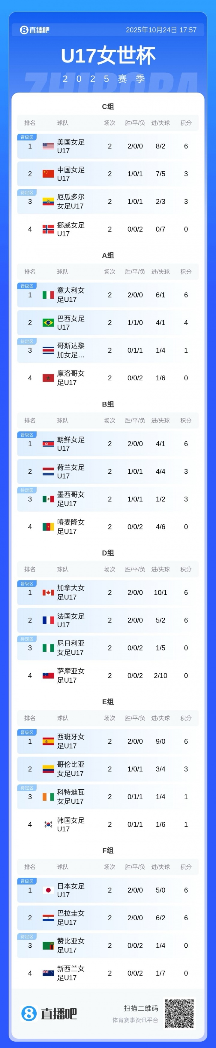 本届U17女足天下杯共有24队分为6个小组,每组前二以及4个得益最佳的小组第三构成16强。若中国女足U17末轮退让,则可能需要以小组第三的身份与其他队比拟战绩。